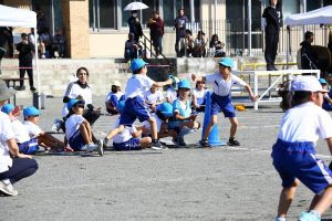 勝負を決する「おたすけ綱引」きでも各チーム力を合わせてがんばりました。「がんばれ。がんばれ。」両チームからの声援もとび交い大変盛り上がりました。赤組も白組も勝っても負けても最後まで力を出し切りました。見事に今年の運動会のめあてを達成しました。